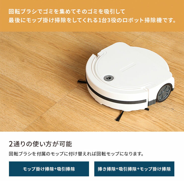 ●モップは取り外して丸洗いOK!定格電源(ACアダプタ):AC100V〜240V 50/60Hz、OUTPUT:DC5V 0.5A充電用電池:リチウム電池 DC7.4V 2200mAh動作時間:約2時間連続使用(満充電時)充電時間:約4時間吸引圧:約3kpsダストボックス容量:約160ml動作音:約66dB本体寸法:約幅255×奥行249×高さ80mm本体質量:約1200g付属品:充電器、回転ブラシ×2、回転モップ×2、モップ※装着済み、モップ固定スタンド、取扱説明書兼保証書■生産地:中国■素材・成分:本体:ABS、駆動輪:TPR、前輪:PP【送料について】北海道、沖縄、離島は別途送料を頂きます。