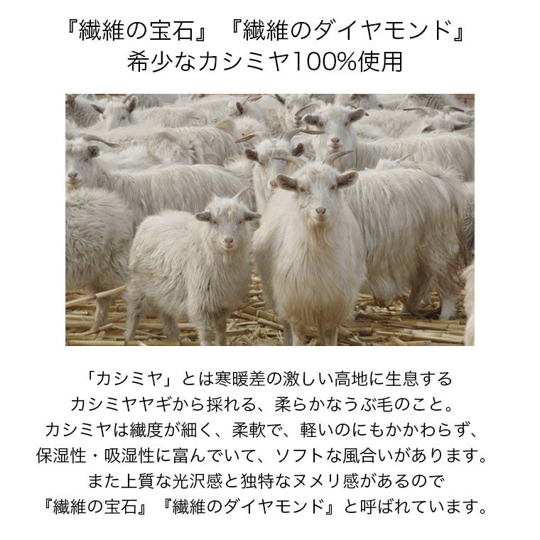 【カシミヤについて】 カシミヤとは、インド北部のカシミール地方を原産とし、中国奥地(内モンゴル)、モンゴル、イランなどの山岳地帯に生息するカシミヤヤギから採取した毛のこと。